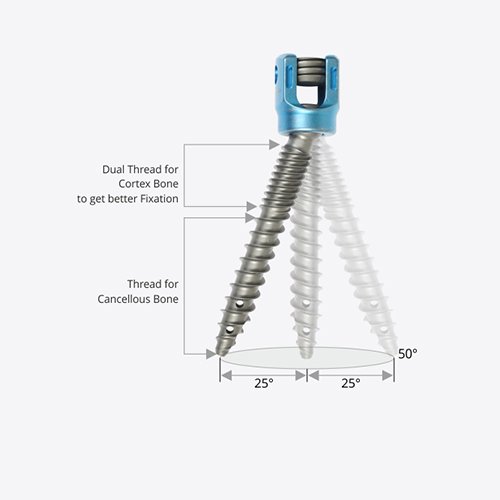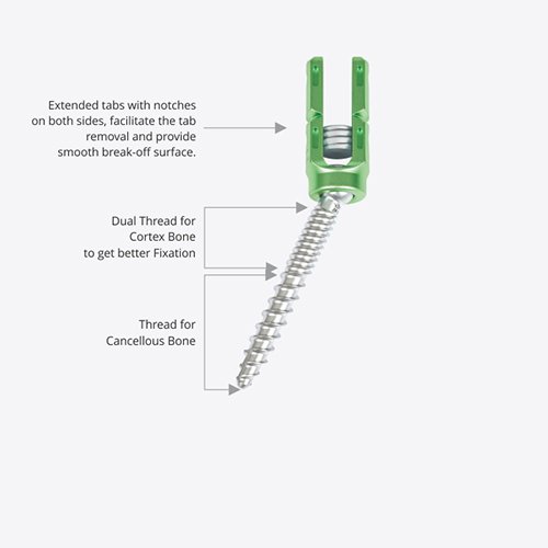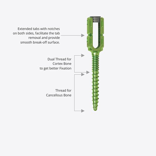 The Fenestrated Cannulated Dual Thread Screw is designed with double thread, the upper thread is made finer to engage with bone more effectively and resist the backing out of the screw. Similarly, the lower thread is made coarser to engage more with the pedicle and prevent the pull-out of the screw.